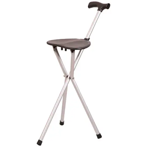 Siddestokken kan stå som en stol og er nem at folde sammen, kan maksimalt klare 90 kg. Sædehøjde 50 cm, håndtag 85 cm, lavet af aluminium, let og tag med