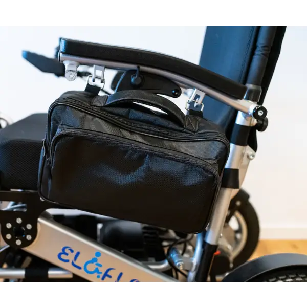 Tasken fastgøres ved hjælp af kroge, der skrues fast under el-kørestolens armlæn. Så hægter du blot tasken af og på fra indersiden af armlænet, hvilket gør det nemt for dig at tage tasken af, når det er nødvendigt, uden at den bliver stjålet.