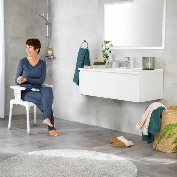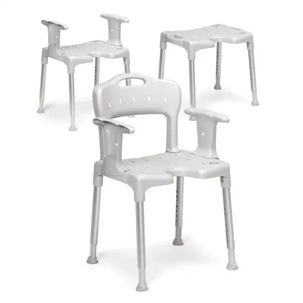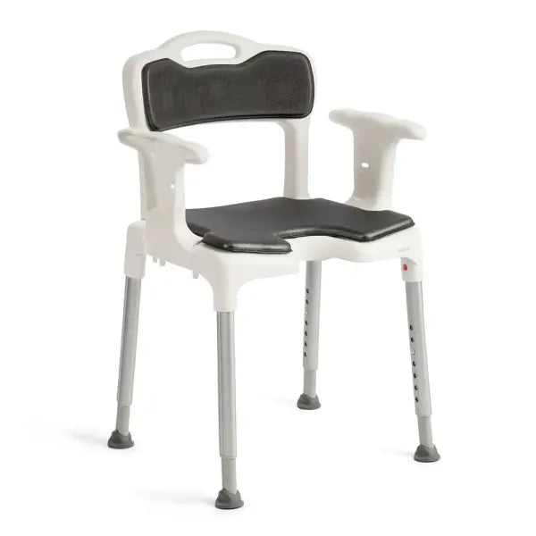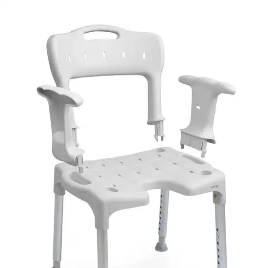 Etac-suihkutuoli Swift täydellisenä käsi-/selkätuella
