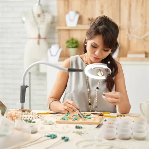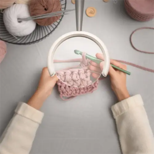 Med det grå handtaget kan man enkelt kan manövrera och vrida lampan. Justera ljusstyrkan efter önskemål med ett urval av 3 ljusstyrkenivåer och se ditt arbete tydligt och med fri sikt tack vare den stora 13 cm (1,75X) förstoringslinsen.