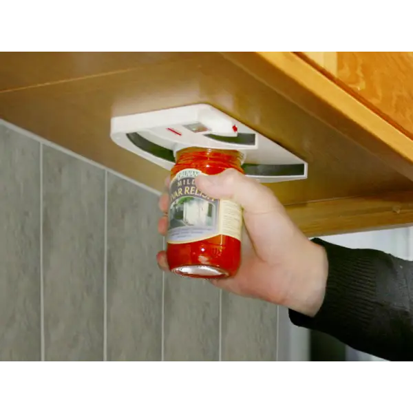 Tack vare detta behöver man inte trycka och vrida burken samtidigt. Den har även en inbyggd kapsylöppnare. Skruvas fast under ett överskåp (skruvar medföljer).