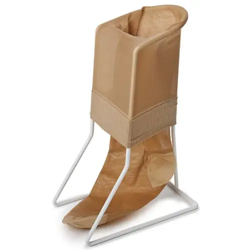 Strumpan träs över stålställningen sedan stoppar du ner foten i strumpan. Därefter drar du upp strumpan över foten där den nu sitter på plats.