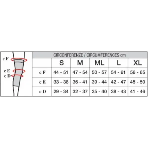 Elastiskt sömlöst knästöd med en kompression på 23/32 mmHg, perfekt anpassat till benet: den kraftiga sidostickningen stöder leden, det mjuka och lätta materialet mot knäskålen och i knävecket underlättar rörelser. Det nydanade resårbandet med silikonkrage håller alltid knästödet på plats. Idealisk som stöd vid sportutövning, efter knäskador, blåmärken, ledskador och vid rehabilitering efter operation. Tillverkad med en bakteriostatisk tråd med silverjoner, vilka motverkar uppkomst av bakterier och medger huden att andas och värmeregleras. Tvätta silikonbandet med en mild tvål före den första användningen så att den fäster bättre mot huden. Högteknologisk lösning för det bästa stödet för dina leder.